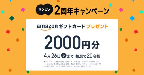 いつもご利用いただき、ありがとうございます。マンガノ運営チームです。 たくさんのユーザーにご利用いただき、マンガノは4/21に2周年を迎えます。 それに合わせて以下のキャンペーンを実施します。 皆様と一緒に2周年を祝っていきたいと考えておりますので…